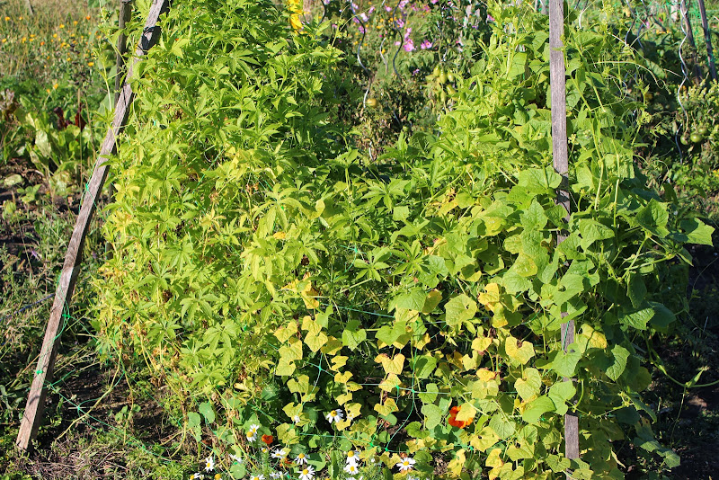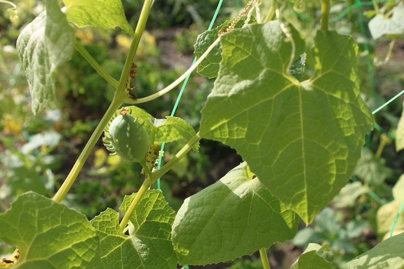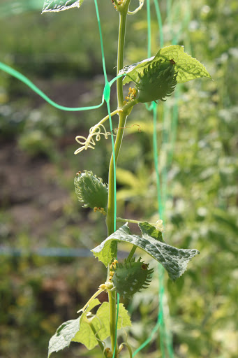 Anfang Mai in die Erde gesteckt wachsen aus den Samen sehr rasch stattliche Pflanzen heran, welche sich mit ihren Ranken an allem festhalten was sie so zu fassen bekommen. Ein Rankgerüst welcher Art auch immer ist daher unbedingt erforderlich. Ich habe es noch nicht versucht, aber vermutlich kann man die Ernte etwas verfrühen wenn man die Pflanzen an einem frostfreien Ort vorzieht und nach dem letzten Frost Mitte Mai ins Freiland setzt. Sobald die Pflanzen mal zu wachsen begonnen haben gibt es kein halten mehr. Innerhalb kurzer Zeit erklimmen sie das Rankgerüst und überwuchern es komplett. Die Ernte setzt etwas später ein als bei herkömmlichen Gurken, hält dafür bis zum Frost an. Neben den Früchten kann man auch die jungen Blätter und Triebe essen. Die Früchte können je nach Sorte sehr unterschiedlich aussehen. Bisher habe ich zwei verschiedene Sorten angebaut, die sich nicht nur in der Form der Früchte und Blätter sondern auch in der Wuchsfreudigkeit ein wenig unterschieden haben.