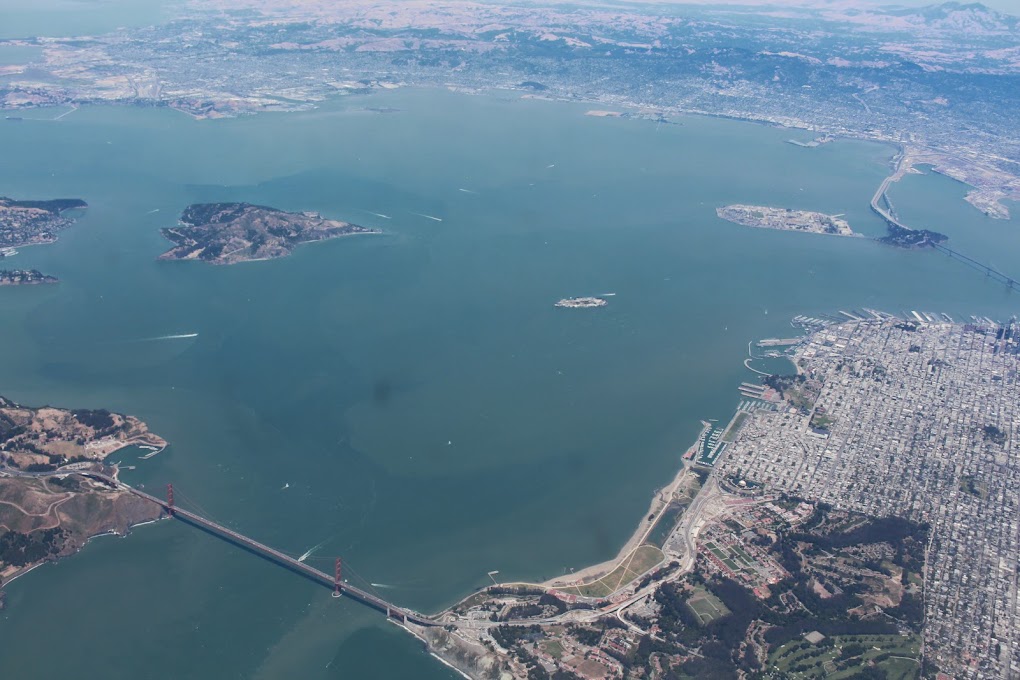Vom Flugzeug aus hatten wir schon einen tollen Blick auf San Fransisco (rechts unten) und die Golden Gate Bridge (links unten). Das winzige Inselchen in der Mitte ist Alcatraz.