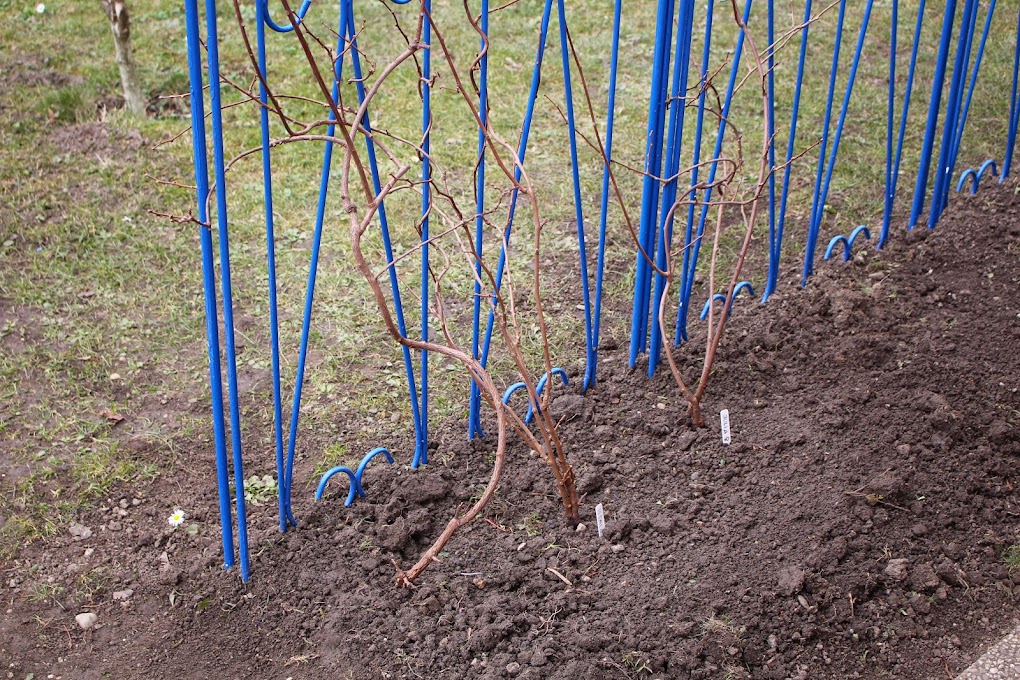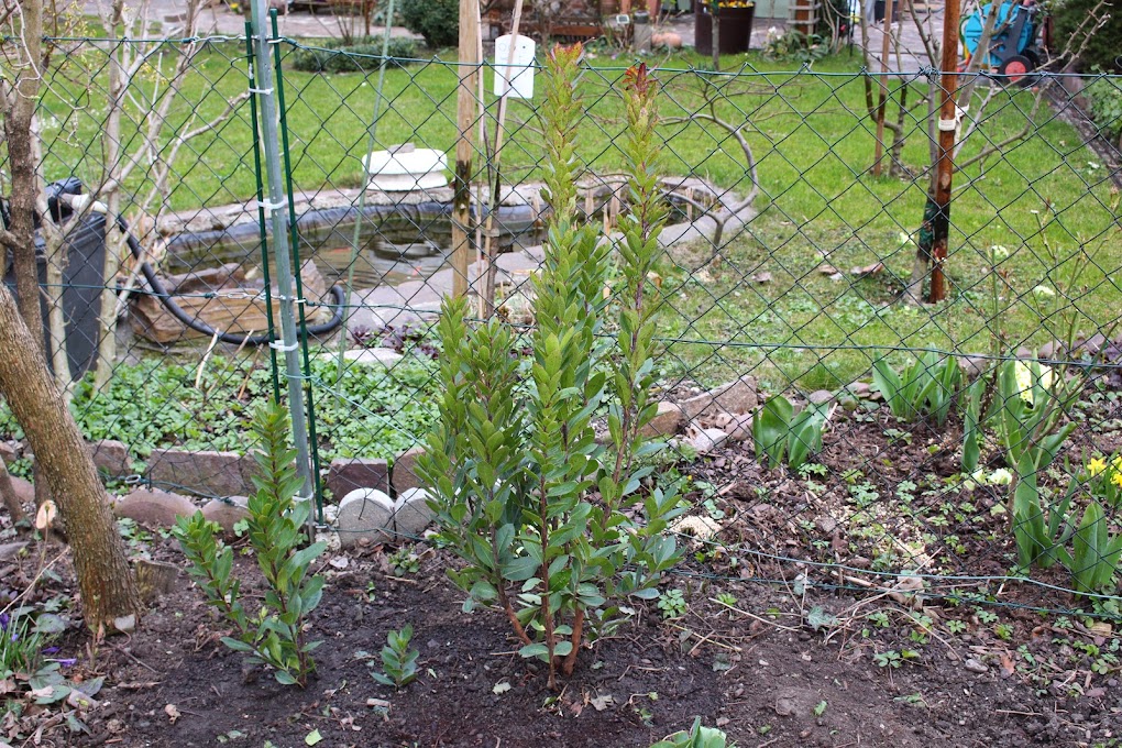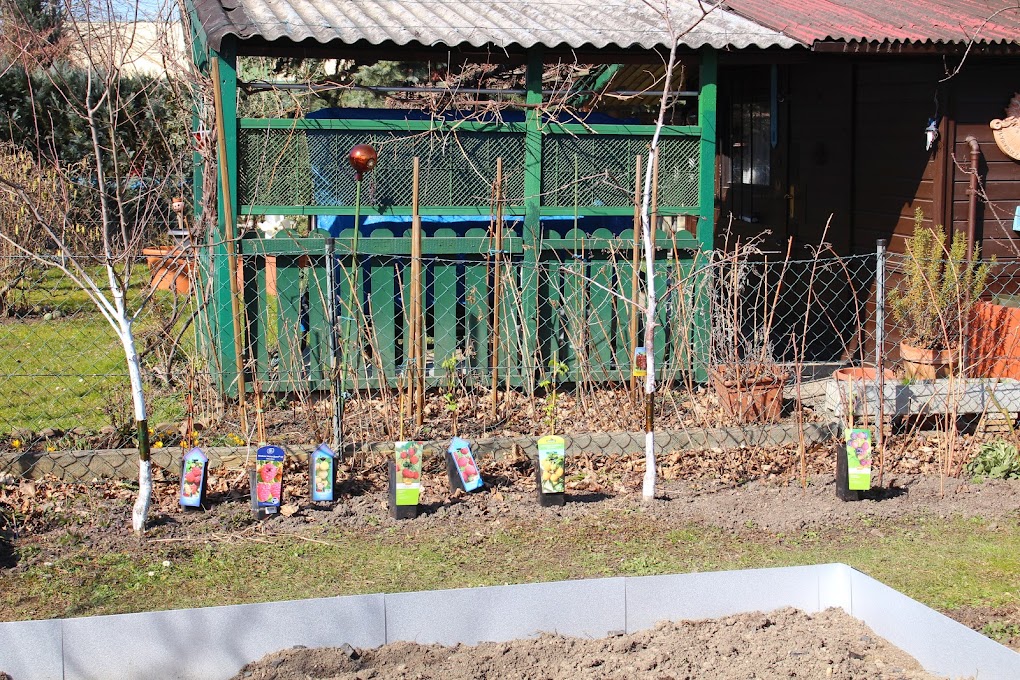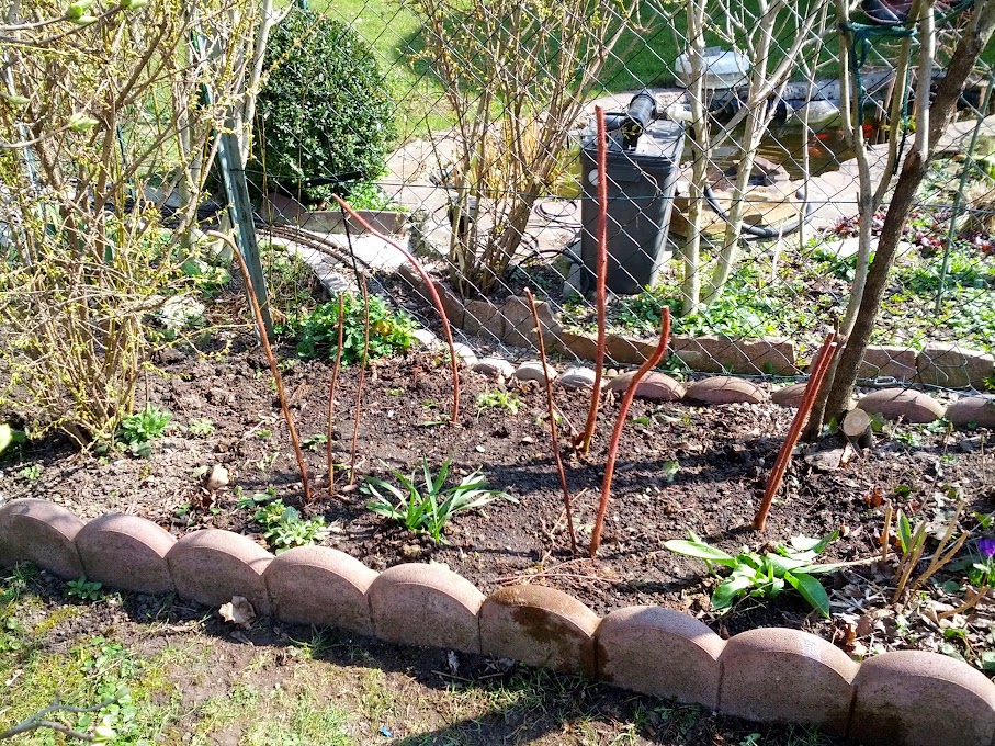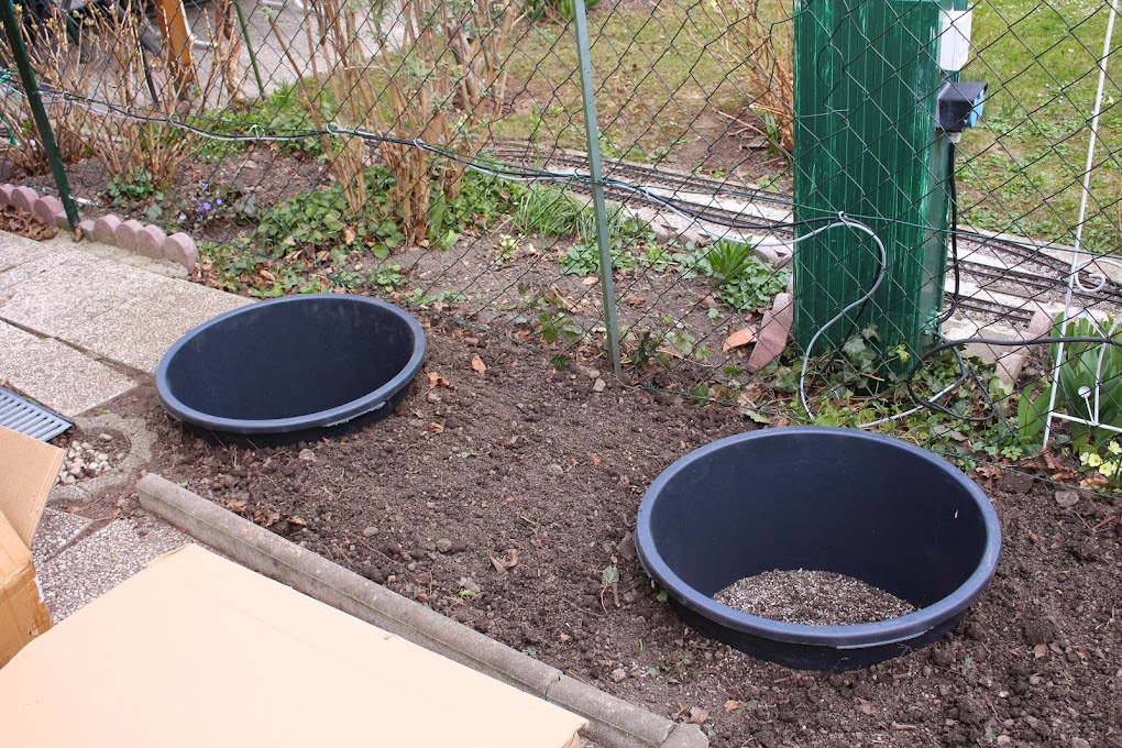 Für die Heidelbeeren haben wir Mörteltonnen vergraben die nur darauf warten, dass wir sie mit Rhododendron Erde füllen und die Heidelbeeren hinein setzen. Eine Pflanze haben wir schon, die restlichen drei (zwei pro Mörtelwanne) kommen theoretisch im Mai.