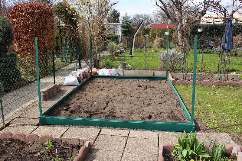 Nachdem das Fundament mal montiert war haben wir den Boden einmal gründlich umgegraben und massenhaft große (Ziegel-) Steine sowie einen halb vermoderten Baumstumpf zutage gefördert.
