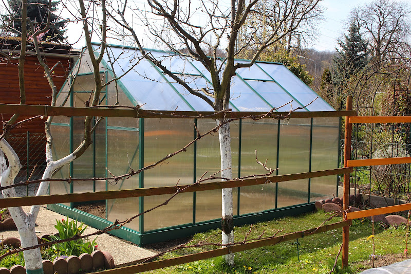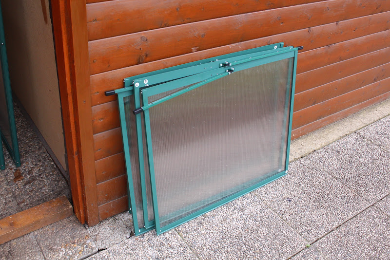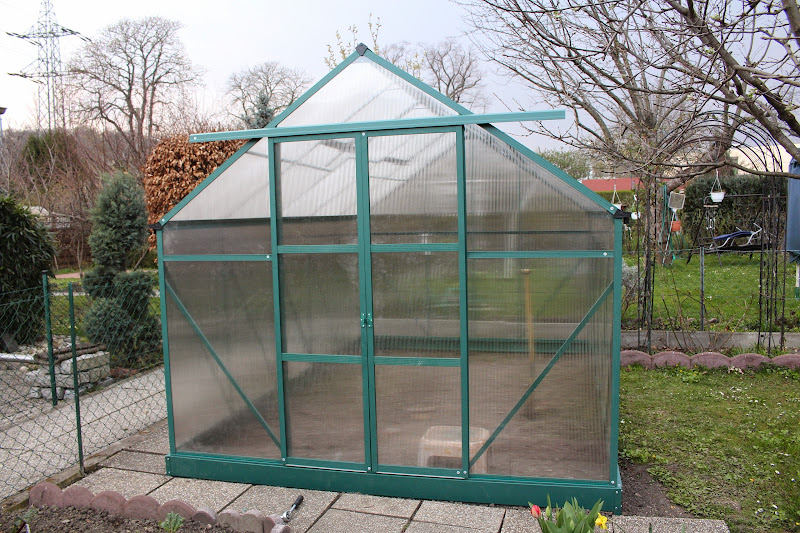 Geplant war es ja von Anfang an. Nach genauem Ausmessen des Platzes und durchforsten diverser Angebote haben wir uns für ein Gewächshaus mit 9 Quadratmeter Grundfläche entschieden.
