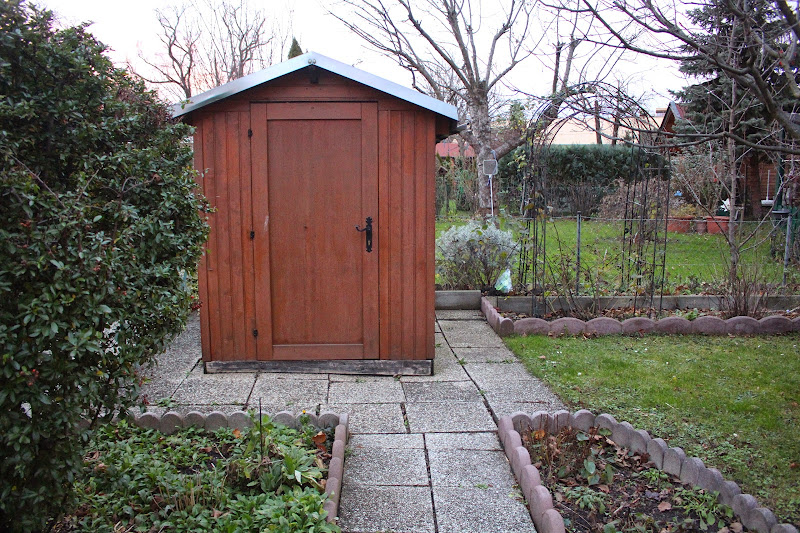 Wer genau hinsieht wird erkennen, dass da schon eine Hütte steht, ein Geräteschuppen um genau zu sein. Unter dem Schuppen liegen jede Menge Waschbetonplatten (50x50x5cm)