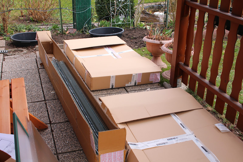 Geliefert hatten wir das Gewächshaus ja schon vor einer Weile bekommen. Hübsch verpackt in ein paar Kartons.